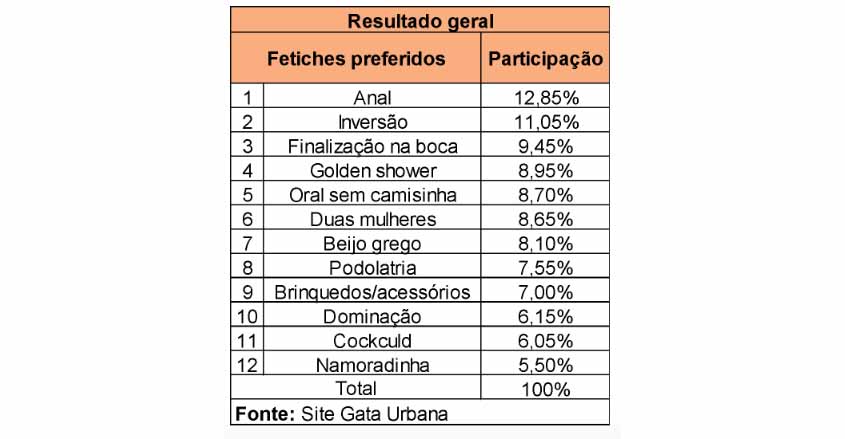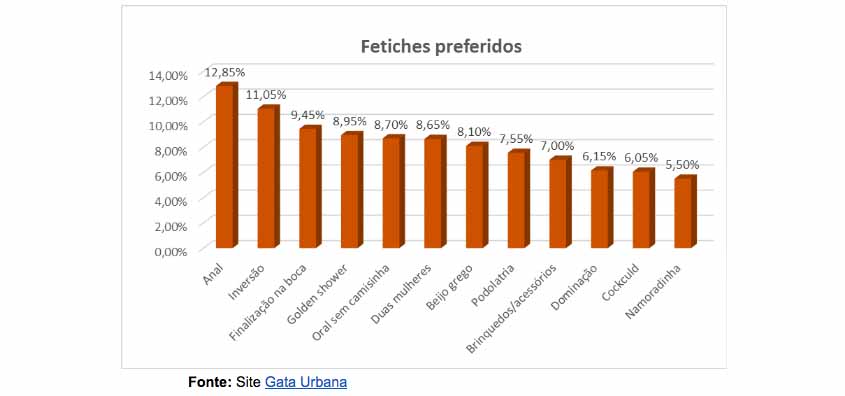 O levantamento organizado pelo site Gata Urbana em nove cidades do país aponta que cinco fetiches correspondem a mais da metade das solicitações junto a essas garotas de programa. Entre esses apelos, despontam o sexo anal, a inversão, a finalização na boca, o oral sem camisinha e o golden shower.