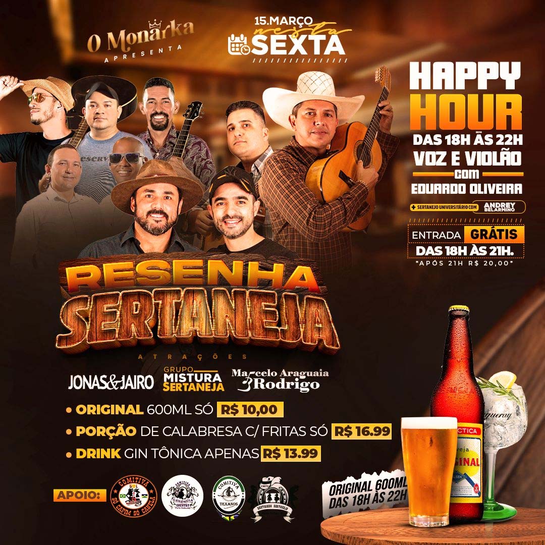 Apoio das comitivas: Só Capim, Só Canela; Gerência Country; Texanos e Brutaiada Sertaneja, o evento músical 'Resenha Sertaneja', do O Monarka, vai receber nesta sexta-feira , dia 22, apresentações de Luan Maia, da banda Mistura Sertanejo, Marcelo Araguaia & Rodrigo, Jonas & Jaíro.
