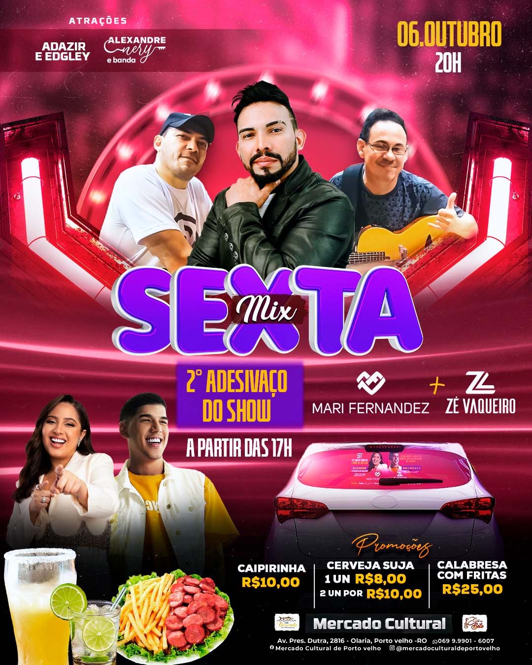 Na véspera do lançamento de vendas dos ingressos promoções do primeiro lote das diversas áreas para o show Mari Fernandes e Zé Vaqueiro, a equipe de promoções da empresa ST Eventos vai "invadir", às 17h, o evento musical "Sexta Mix" do Mercado Cultural para realizar o 2º adesivaço, para vocês que são fãs desses consagrados músicos, possam ganhar o seu ingresso na faixa!