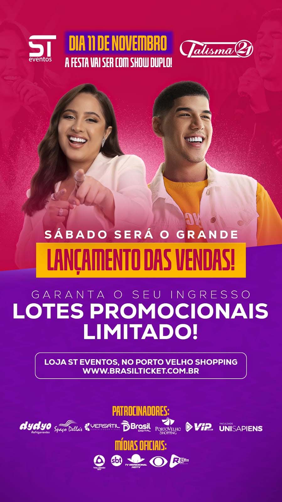O lançamento das vendas do ingressos é neste sábado, dia 07, podendo ser virtual pelo site: www.brasilticket.com.br ou na loja física da St Eventos, localizado na entrada F do Porto Velho Shopping.