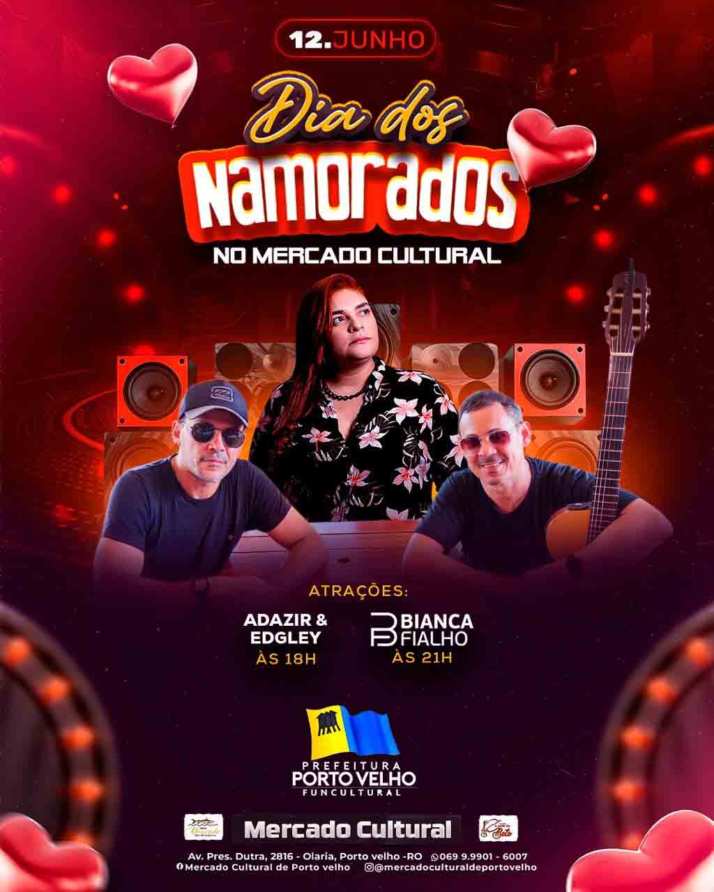 Nesta quarta-feira, dia 12, a partir 18h30, com sorteios de brindes vai ter a festa do Dia dos Namorados no Mercado Cultural de Pvh, com show duplo. A primeira atração será às 18h30, com a consagrada dupla de MPB e Pop Rock, Adazir & Edgley, na sequência, show de Bianca Fialho e banda mandando as melhores do sertanejo universitário.