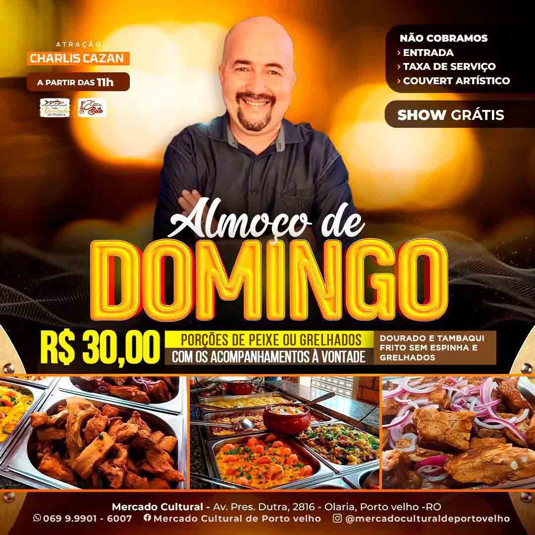 Já às 12h, show de Charlis Kazan no almoço promocional de domingo, onde a refeição custa apenas R$ 30.00 por pessoa.