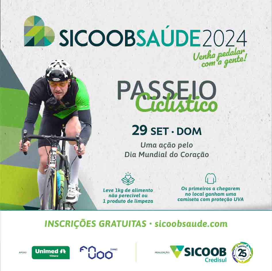 A Sicoob Credisul abriu as inscrições para o Sicoob Saúde 2024, o tradicional passeio ciclístico pelo Dia Mundial do Coração. O evento acontecerá no dia 29 de setembro, simultaneamente em 36 cidades onde a Sicoob Credisul tem agências, reforçando o compromisso da cooperativa em promover saúde e bem-estar em todas as comunidades onde atua. A inscrição é gratuita e deve ser realizada no site sicoobsaude.com.