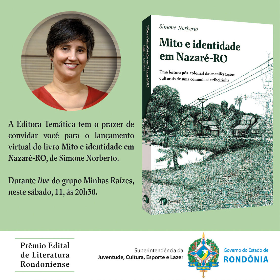 O resultado de uma longa pesquisa realizada durante o mestrado em Letras, com foco na comunidade de Nazaré e suas manifestações culturais, será disponibilizado em formato de livro. A obra Mito e Identidade em Nazaré-RO, uma leitura pós-colonial das manifestações culturais de uma comunidade ribeirinha, de Simone Norberto, será lançada virtualmente neste sábado, durante uma live organizada pelo grupo musical Minha Raízes, um dos inspiradores do estudo.