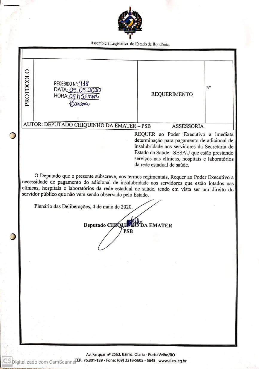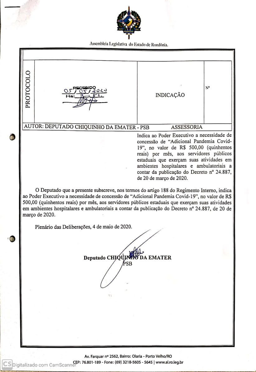 A pedido da Presidente do Sindicato dos Trabalhadores em Saúde no Estado de Rondônia (SINDSAÚDE), Célia Campos, o deputado estadual Chiquinho da Emater encaminhou ao Governo do Estado a indicação de implantação da insalubridade grau máximo (40%) aos profissionais da saúde, devido ao período crítico da pandemia causada pelo novo coronavírus.