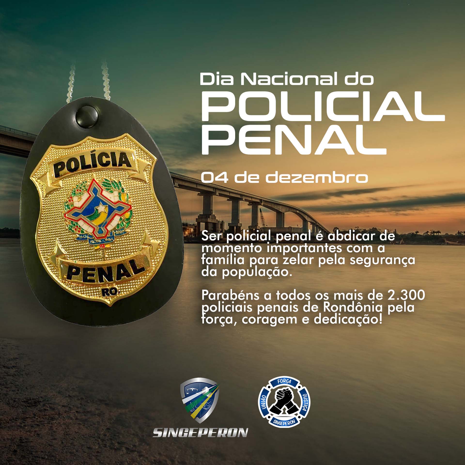 No dia 04 de dezembro é comemorado o Dia Nacional do Policial Penal e o Sindicato dos Policiais Penais e Agentes Socioeducativos do Estado de Rondônia (Singeperon) aproveita a celebração desta data para parabenizar os policiais penais que garantem a segurança do sistema penitenciário.