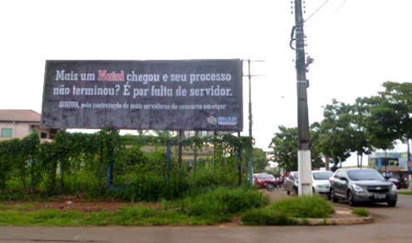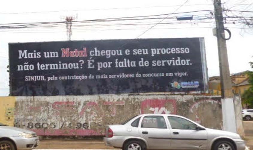 O Sindicato dos Trabalhadores no Poder Judiciário do Estado de Rondônia (Sinjur), encabeçou uma campanha de protesto que consiste na distribuição de “outdoors” espalhados pela cidade de Porto Velho, com a seguinte frase : “Mais um Natal chegou e seu processo não terminou? É por falta de servidor! Sinjur pela contratação de mais servidores do concurso em vigor”.