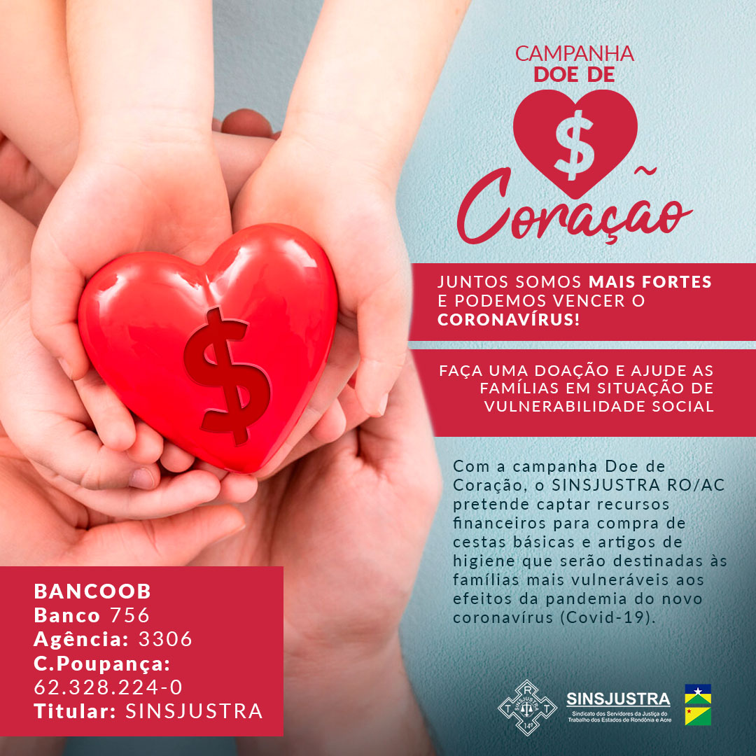 Preocupado com as famílias mais vulneráveis aos efeitos da pandemia do novo coronavírus (Covid-19), o Sindicato dos Servidores da Justiça do Trabalho dos Estados de Rondônia e Acre – SINSJUSTRA lança a campanha “Doe de Coração”. O propósito é captar recursos financeiros para compra de alimentos não perecíveis e produtos de higiene que serão destinados a entidades sem fins lucrativos que atuam junto a grupos vulnerabilizados da sociedade.