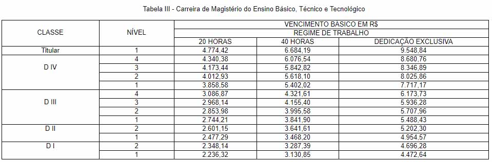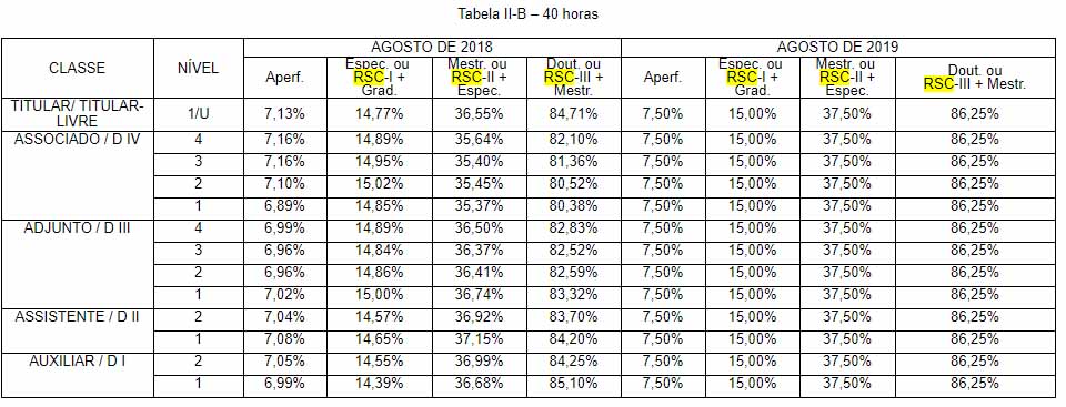 Confira abaixo as tabelas com os valores referentes ao Regime de Dedicação Exclusiva e ao RSC. Lembrando que há variação no percentual para cada professor, dependendo do nível.