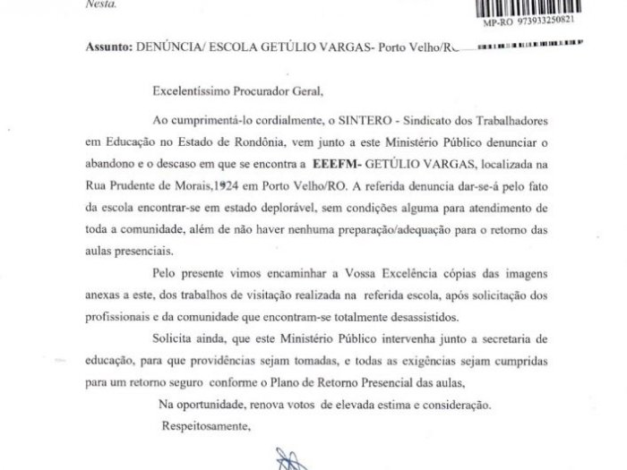 O Sintero protocolou denúncia ao Ministério Público do Estado de Rondônia (MP/RO), nesta quarta-feira (25/08), relatando que a E.E.E.F.M Getúlio Vargas, localizada em Porto Velho, encontra-se em condições inadequadas para receber toda a comunidade escolar, tendo em vista os parâmetros estabelecidos no Plano de Retorno Presencial elaborado pela Secretaria de Estado de Educação (Seduc).