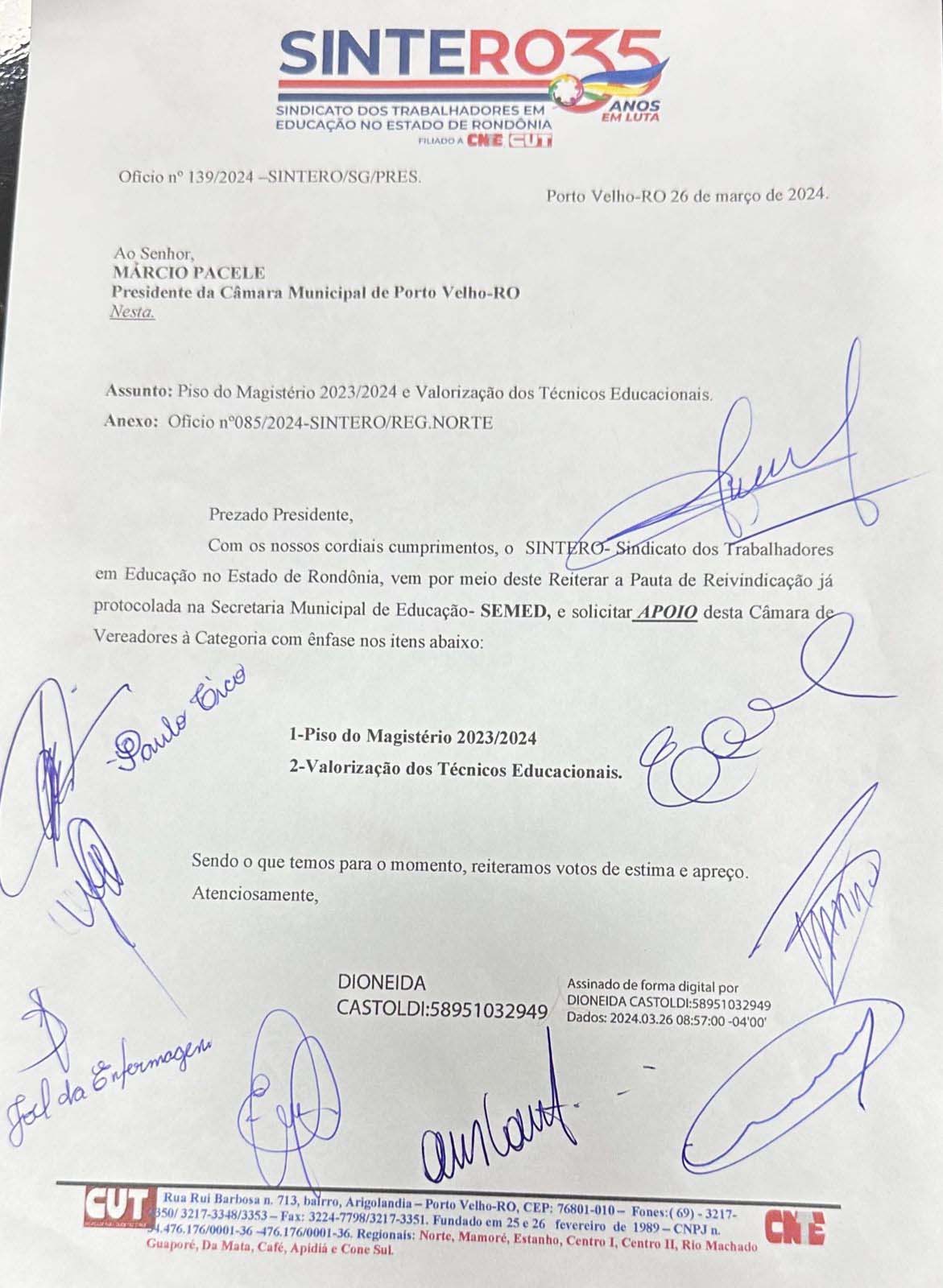 No documento - Ofício n° 139/2024 -SINTERO/SG/PRES - o sindicato reitera à presidência da Câmara, representada por Márcio Pacele, a importância da pauta de reivindicação já apresentada à Secretaria Municipal de Educação (SEMED).