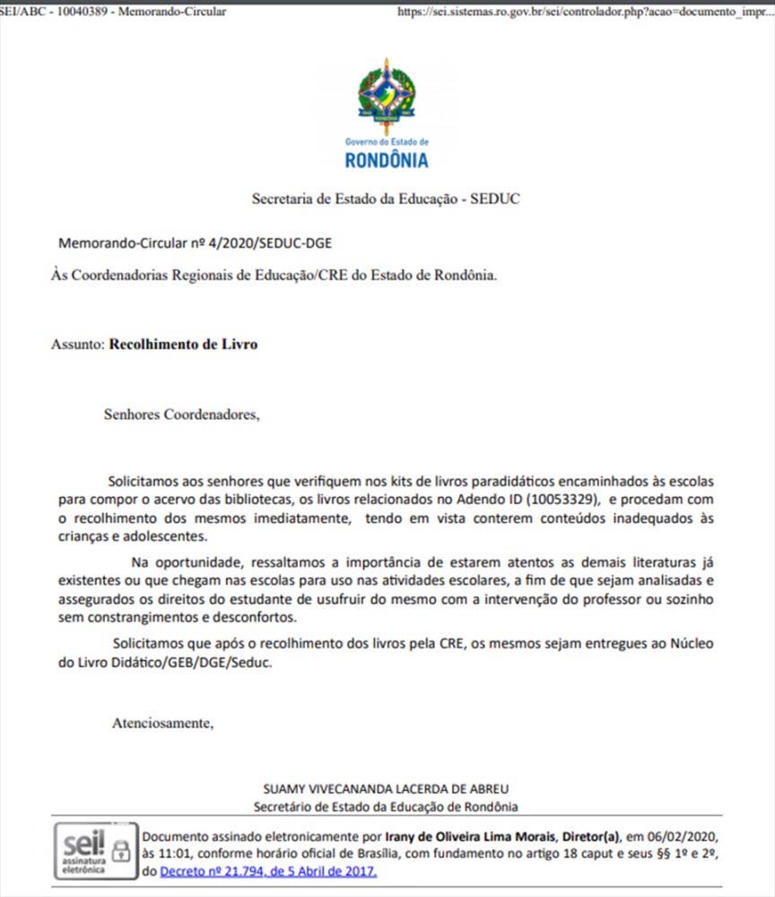 A Direção do Sintero tomou conhecimento de um Memorando Circular publicado nesta quinta-feira (06/02), pela Secretaria de Estado da Educação (SEDUC) de Rondônia, no qual solicita o recolhimento de vários livros, julgados como inadequados às crianças e adolescentes para serem utilizados nas escolas da Rede Pública Estadual. O documento está sendo duramente criticado pela classe dos trabalhadores em educação e pela sociedade que teve acesso às informações através das redes sociais.