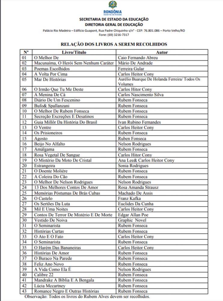 Os livros são de autores como: Mário de Andrade, Caio Fernando Abreu, Rubem Fonseca, Nelson Rodrigues, Machado de Assis, entre outros, considerados como clássicos da literatura brasileira, perpetuados por gerações e gerações de leitores ao longo da história do Brasil. Portanto, o Sintero não entende o comportamento censurável por parte da Seduc em pedir recolhimento dessas obras nas escolas.