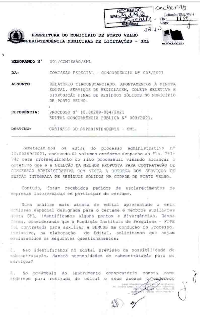 Porto Velho, RO - O Superintendente Municipal de Licitação de Porto Velho (SML), Guilherme Marcel Gaioto Jaquini, enviou um memorando ao secretário municipal de Serviços Básicos (Semusb), Wellen Prestes, apontando algumas irregularidades no edital da concorrência pública para a contratação da empresa responsável pelos serviços de reciclagem, coleta seletiva, e disposição final dos resíduos sólidos de Porto Velho (licitação do lixo).