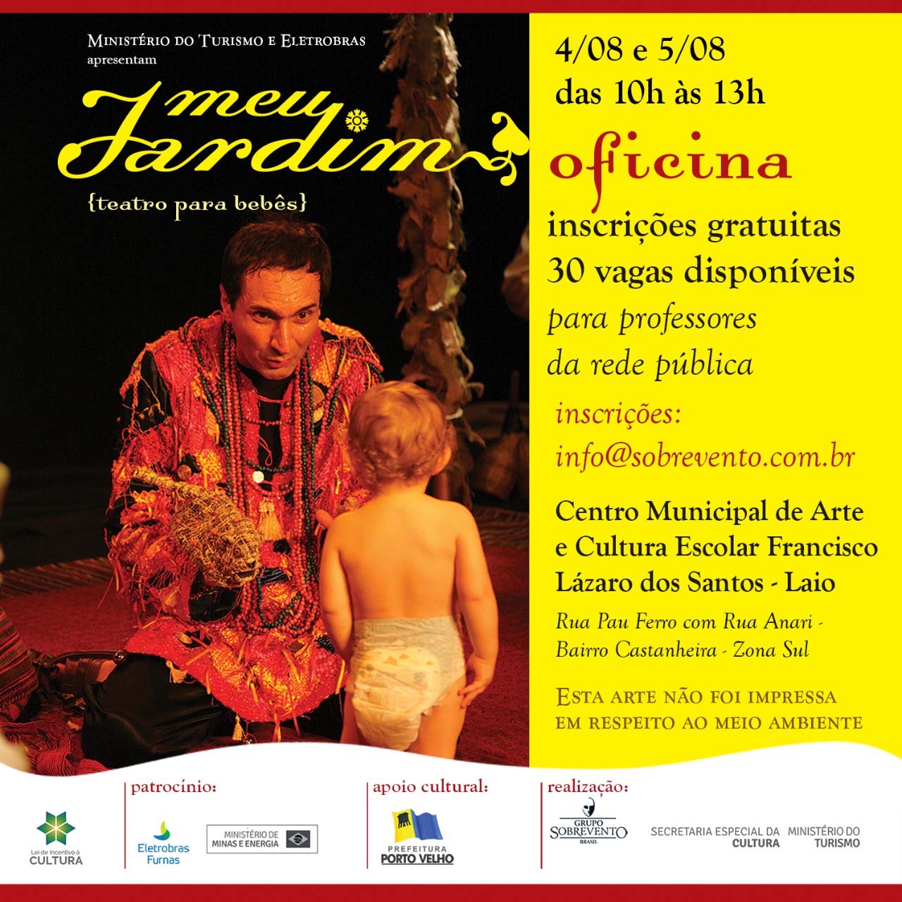 O Grupo Sobrevento, pioneiro em Teatro para Bebês no Brasil e considerado, internacionalmente, um dos maiores expoentes brasileiros do Teatro de Animação, apresenta o espetáculo MEU JARDIM, direcionado a bebês, com ENTRADA FRANCA. As apresentações acontecem no dia 4 de agosto, quinta, às 15h, e no dia 5 de agosto, sexta, às 9h e às 15h, para educadores e alunos de creches públicas. No dia 6 de agosto, sábado, serão realizadas duas sessões para o público familiar, às 9h e às 10h30.