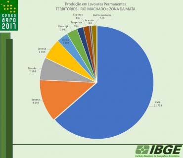 Já entre as lavouras permanentes, o café segue na liderança nas regiões de Cacoal e Rolim de Moura, com uma produção de 21.700 toneladas em 2017. A banana aparece em segundo lugar, com 4.147 toneladas; 2.196 toneladas de mamão. Na sequencia aparecem 2.013 toneladas de laranja; 1.102 toneladas de limão; 1.061 toneladas de maracujá; 612 toneladas de tangerina; 607 toneladas de cupuaçu; 195 toneladas de acerola. Outras produções, em lavouras permanentes, gerou 518 toneladas de produtos diversos.