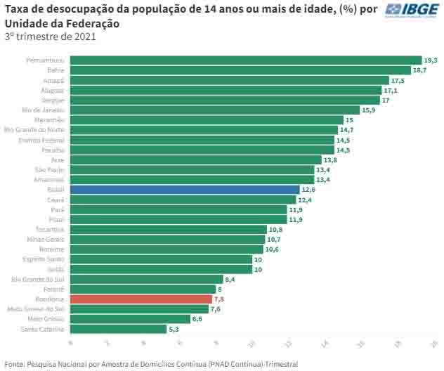 De acordo com a Pesquisa Nacional por Amostra de Domicílios Contínua (PNAD Contínua), Rondônia registrou a menor taxa de desocupação da Região Norte e a quarta menor do país no terceiro trimestre deste ano: 7,8%, ficando atrás de Santa Catarina (5,3%), Mato Grosso (6,6%) e Mato Grosso do Sul (7,6%). A pesquisa é divulgada pelo Instituto Brasileiro de Geografia e Estatística (IBGE).