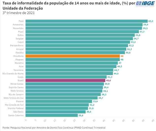 Em relação à informalidade, a taxa em Rondônia ficou estável, atingindo 48% no terceiro trimestre de 2021. A menor taxa foi registrada em Santa Catarina (26,6%) e a maior no Pará (62,2%). Já o índice brasileiro foi de 40,6%. Considera-se informal o empregado sem carteira assinada, o empregador e o contra própria sem CNPJ e o trabalhador familiar auxiliar.