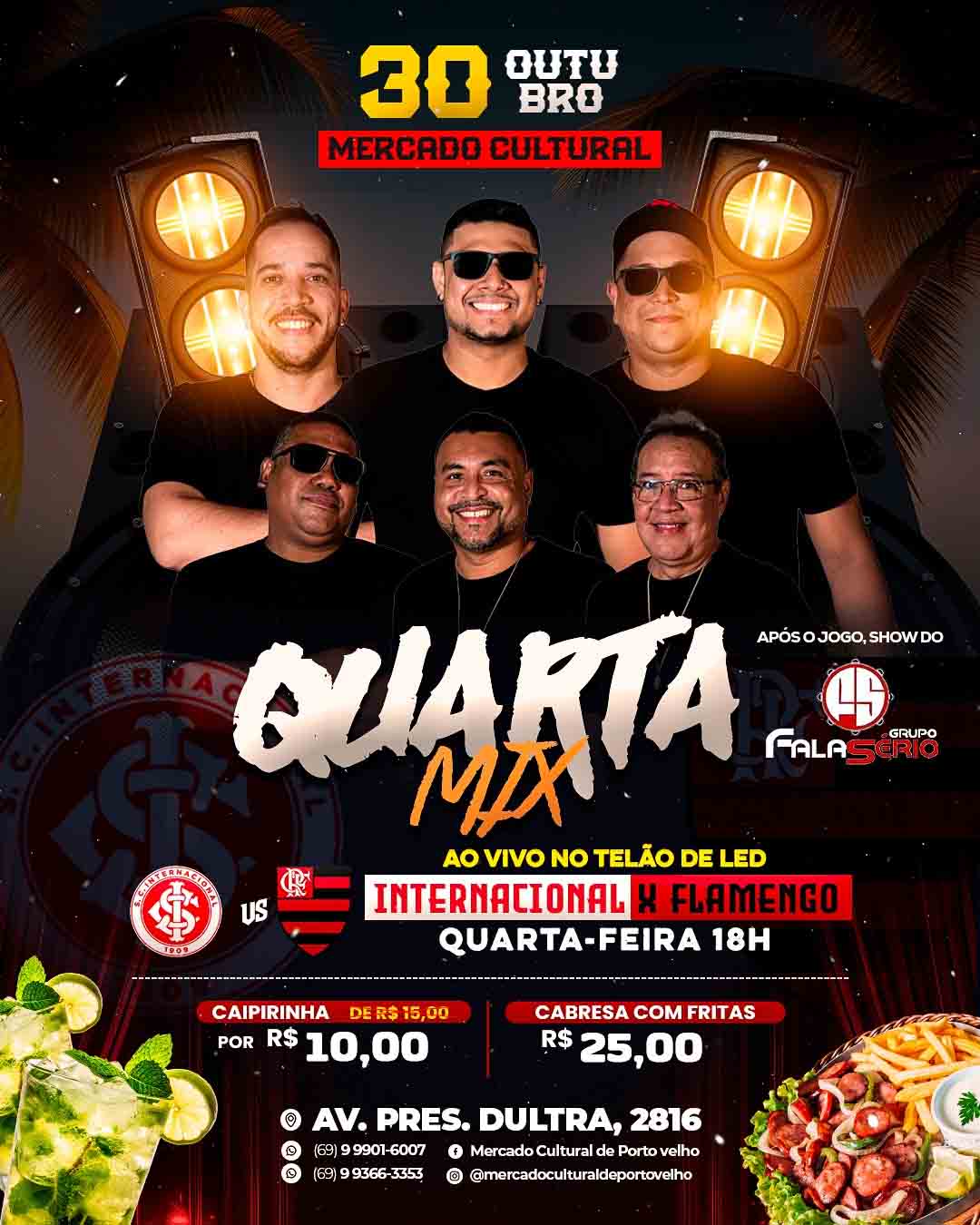 "Estamos esperando vocês Flamenguistas, nesta quarta-feira , dia 30, a partir das 17h, para assistir no telão de Led o jogo do Flamengo contra o Internacional, na sequência, vai ter pagode com o show do grupo Fala Sério no palco do Mercado Cultural", disse o empresário Sinésio Tapajós, permissionário do box Dourado do Madeira, acrescentando os dois eventos não é cobrado entrada, couvert artístico e nem taxa de serviço.
