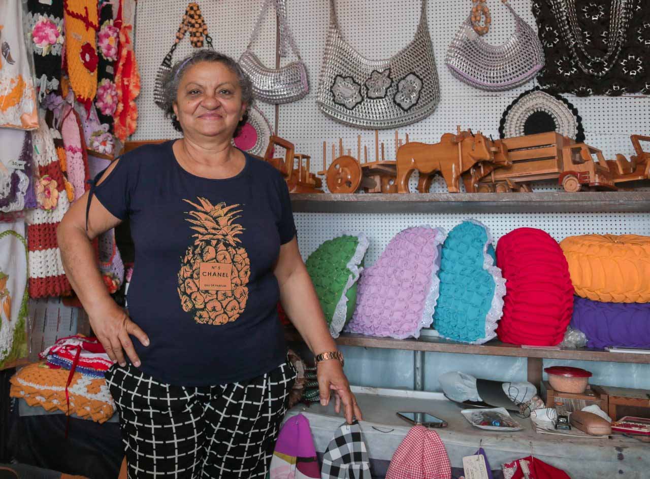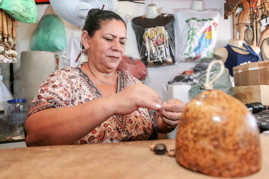 “Amo essa arte e não me vejo sem o artesanato. O artesanato faz parte da minha vida. No dia a dia ou estou vendendo ou estou produzindo. Isso ganha um reforço, pois meu marido também é artesão e lá em casa temos um mundo encantado em nossas conversas criativas. Aqui, na Feira do Sol, o mais bonito é o companheirismo que a gente tem com os colegas artesãos. Nós somos uma família. Aqui uma mão lava a outra. A ajuda vai desde a venda das peças do colegas até a ajuda na confecção de uma peça”, disse Maria de Nazaré Estevão, 57 anos e artesã desde os 13 anos.
