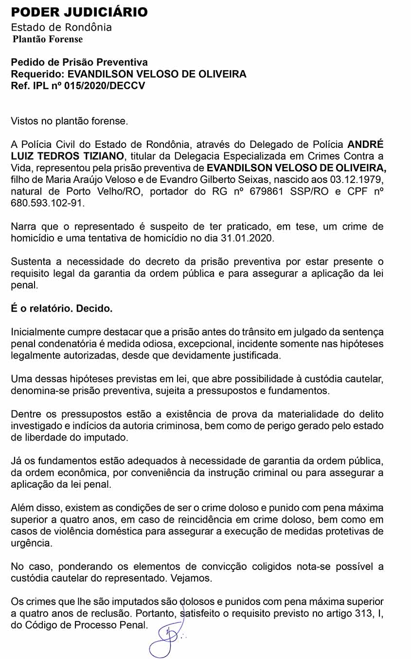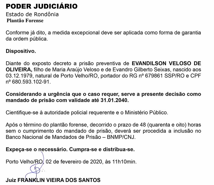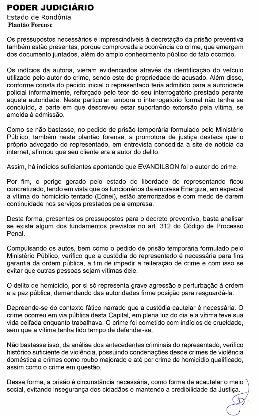 A pedido do Ministério Público de Rondônia, o juiz Franklin Vieira dos Santos, da 3ª Vara Criminal de Porto Velho, decretou, neste domingo, a prisão preventiva do assassino confesso Evandilson Veloso de Oliveira, que, na sexta-feira, 31, matou, com quatro tiros, o eletricista Gerson Francisco Nunes, de 46 anos, da empresa Rondonorte, que presta serviço terceirizado para a Energisa. Um policial civil que atua no caso disse que o criminoso não foi localizado após o decreto de prisão.
