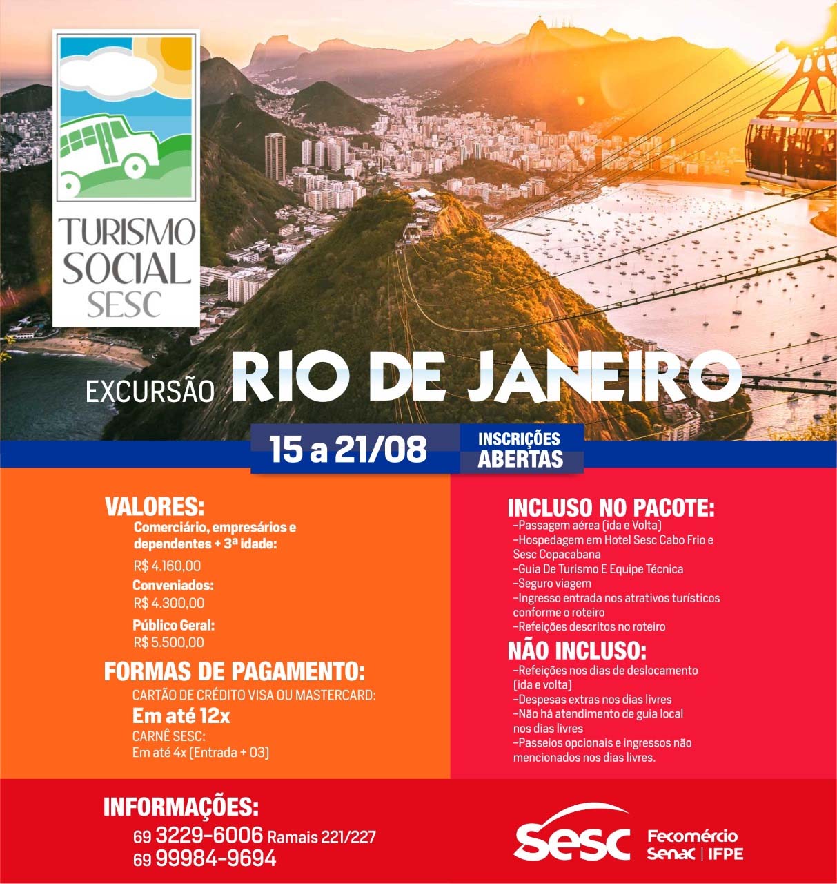 O Sistema Fecomércio/Sesc/Senac de Rondônia, por meio do Sesc/RO, reafirmando seu objetivo de integração, inclusão social e fomentador do desenvolvimento sustentável, abre inscrições para excursão para o Rio de Janeiro, de 15 a 21 de agosto, com pacote promocional para o trabalhador do comércio. A excursão tem como intuito promover roteiros que possibilitem a troca de experiências com a população local, apresentando tradições e manifestações regionais, e proporcionando aos viajantes uma oportunidade de integração com a comunidade e o desenvolvimento solidário e sustentável.