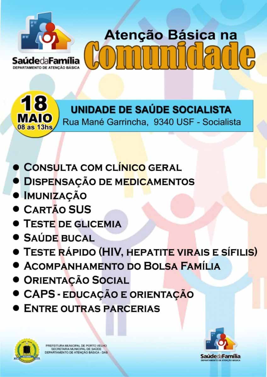A prefeitura de Porto Velho, através da Secretaria Municipal de Saúde (Semusa), dando sequência ao projeto “Atenção Básica na Comunidade,” realiza neste sábado (18/5), de 8h às 13 h, na unidade básica de saúde da família Socialista, diversos atendimentos aos moradores da região.