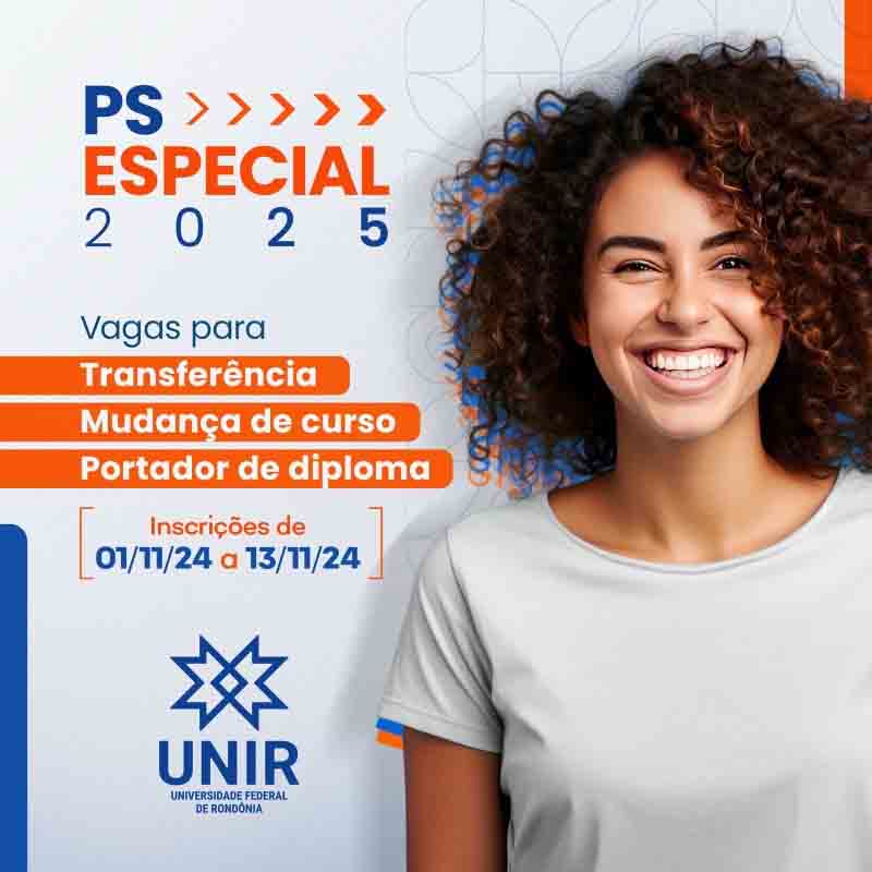 O edital do PS Especial UNIR 2025 na íntegra e demais informações sobre o processo seletivo estão disponíveis no Portal da UNIR e no Portal de Processos Seletivos, diretamente aqui, na página do PS Especial 2025.