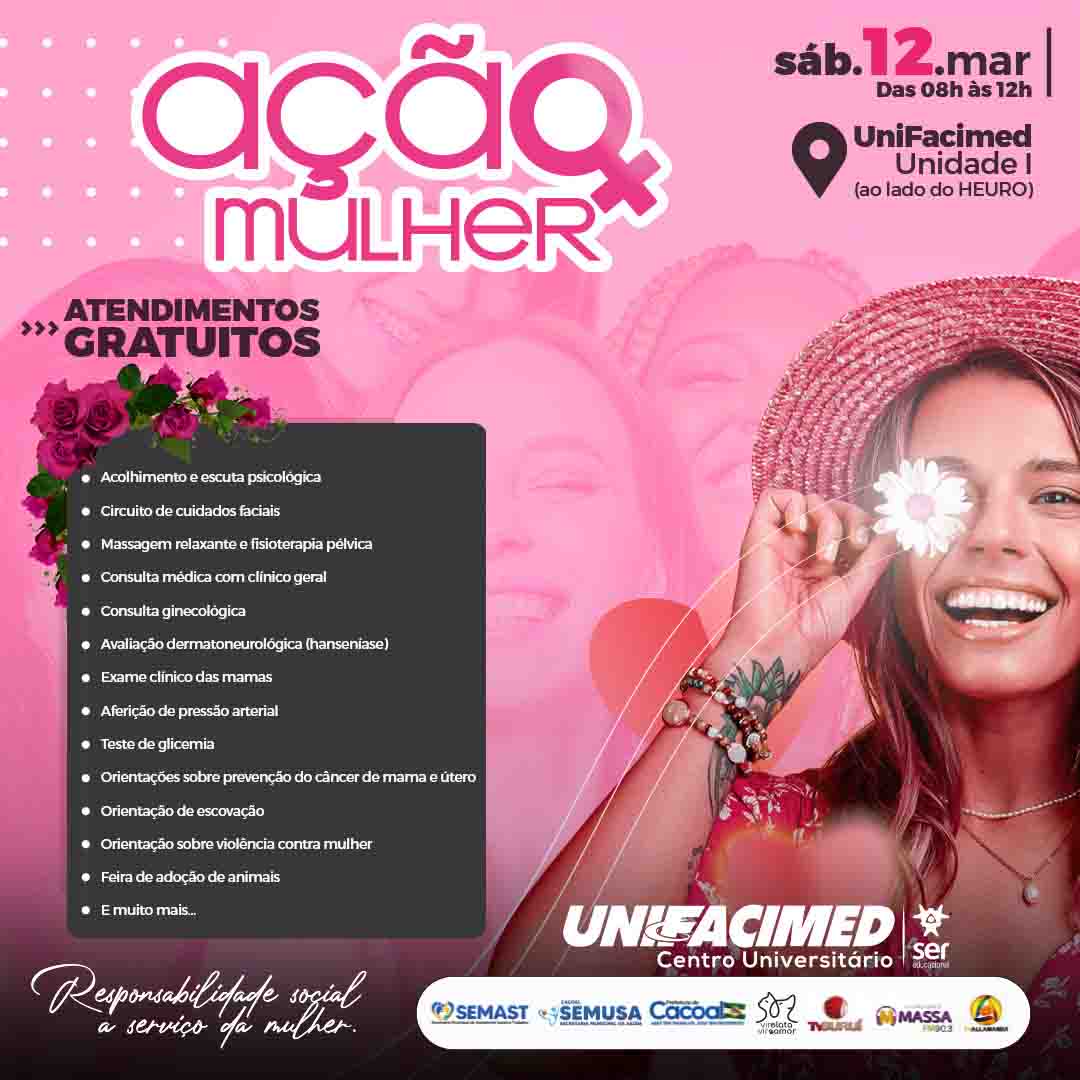 Neste sábado (12), o UNIFACIMED realizará mais uma edição do tradicional evento que tem o objetivo de homenagear as mulheres, o “Ação Mulher". A partir das 8h até às 12h, na unidade I da Instituição, que fica ao lado do Hospital Heuro, acadêmicos e professores estarão preparados para atender o público feminino na maior ação social de Cacoal dedicada às mulheres.
