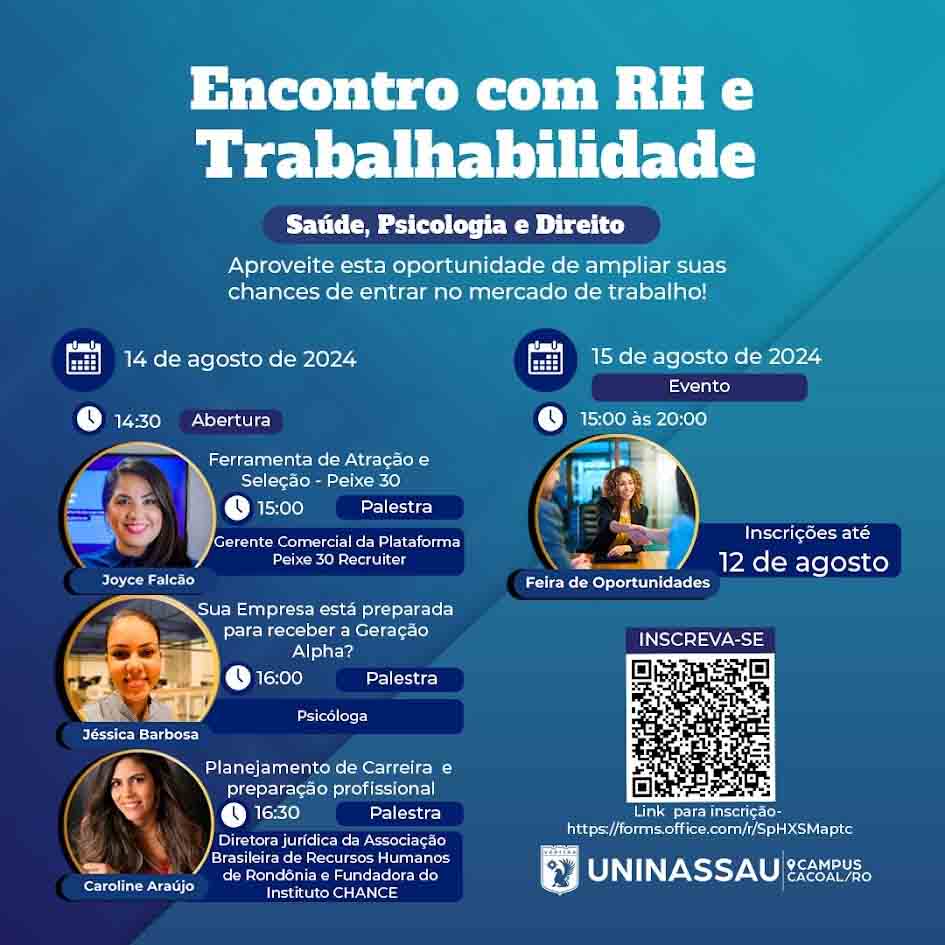 Nos dias 14, das 14h30 às 16h30, e 15 de agosto, das 15h às 20h, a UNINASSAU Cacoal realiza o "Encontro com RH e Trabalhabilidade". Ele acontece no prédio da Instituição de Ensino Superior, na Avenida dos Esportes, número 1038, bairro Incra. O objetivo é possibilitar a entrada dos acadêmicos dos cursos das áreas de Saúde, Psicologia e Direito no mercado de trabalho.