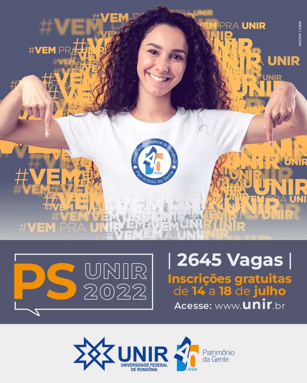 A Universidade Federal de Rondônia (UNIR) publicou nesta segunda-feira (11) o edital do seu Processo Seletivo Discente (PS) 2022, destinado a selecionar candidatos para os cursos de graduação da Instituição ofertados em seus oito campi. As inscrições são gratuitas, e devem ser realizadas entre os dias 14 e 18 de julho. A seleção, como em anos anteriores, será feita por meio das notas do Enem (Exame Nacional do Ensino Médio). Todos os detalhes do PS UNIR 2022 estão disponível no endereço www.unir.br.