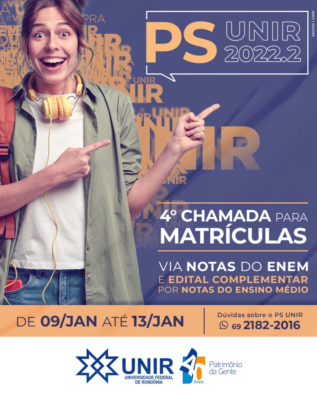 A Universidade Federal de Rondônia (UNIR) realiza a quarta chamada para matrículas de candidatos aprovados no PS UNIR 2022, para os cursos com entrada no segundo semestre letivo (2022.2). Nesta nova chamada são convocados para matrículas os candidatos aprovados por meio das notas do Enem que manifestaram interesse nas vagas, bem como os candidatos aprovados por meio das notas do Ensino Médio (Edital Coplementar). Todas as matrículas devem ser realizadas de modo online por meio deste link, no período de 9 de janeiro de 2023 até às 18h do dia 13 de janeiro de 2023.