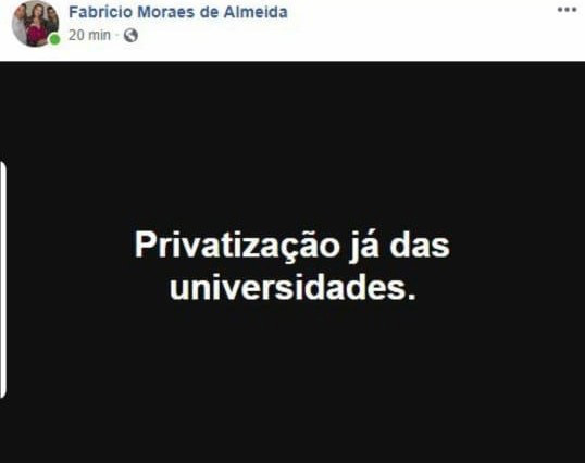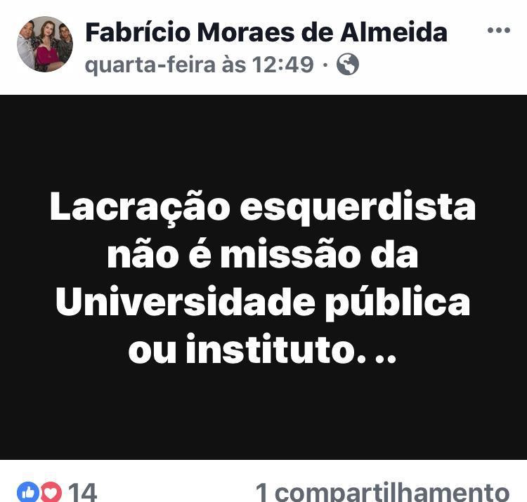 Nas redes sociais, o professor Fabrício defende abertamente a privatização das universidades públicas e reforça o coro do governo Bolsonaro de que estão tomadas pelo que chama de ‘lacração esquerdista”.