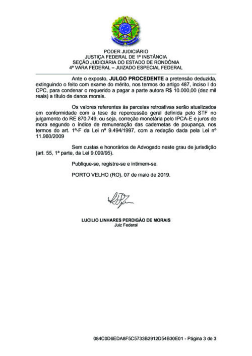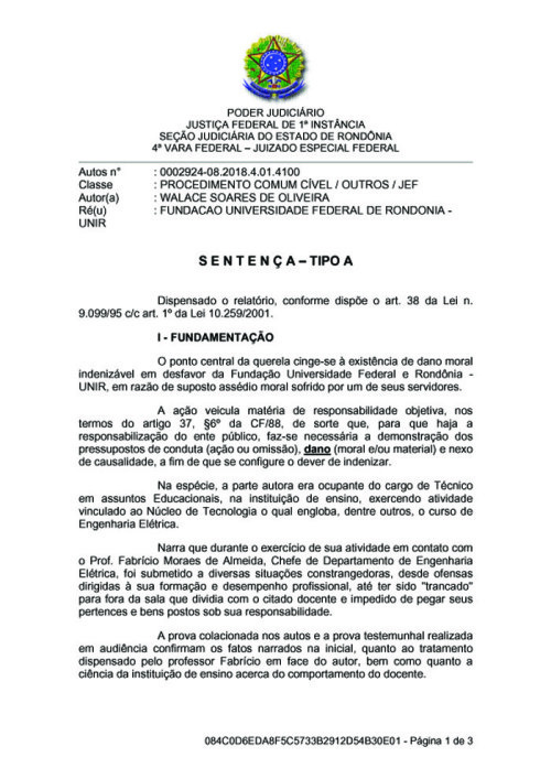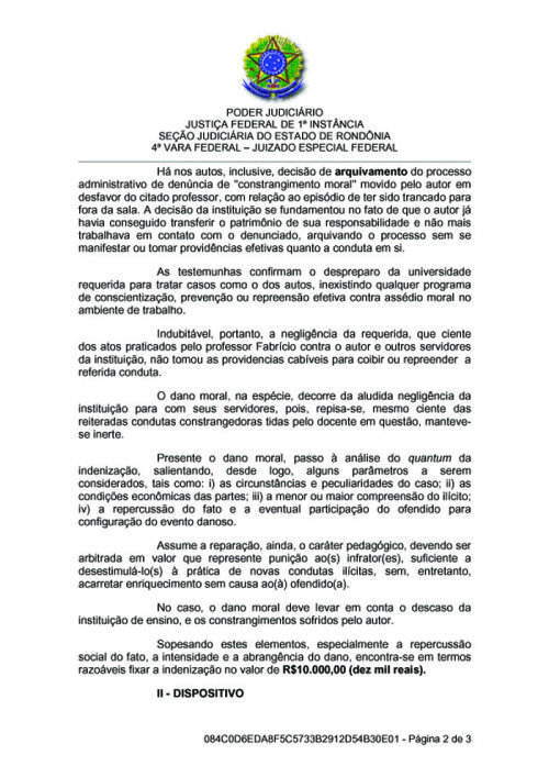 O dano moral que prevê indenização de 10 mil reais a ser paga pela Universidade Federal de Rondônia em sentença do juiz Lucilio Linhares Perdigão de Morais, da 4ª Vara Federal, foi causado pelo professor Fabrício Moraes de Almeida.