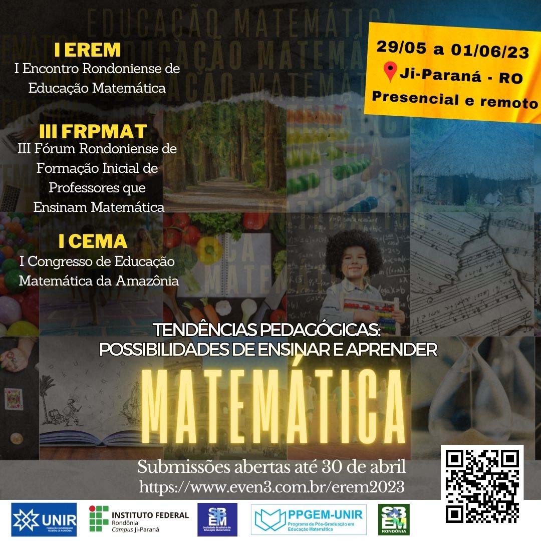 Será realizado entre os dias 29 de maio e 01 de junho de 2023 o I Encontro Rondoniense de Educação Matemática - I EREM, o III Fórum Rondoniense de Formação Inicial de Professores que Ensinam Matemática - IIIFRPMAT e o I Congresso de Educação Matemática Amazônico I CEMA, de forma integrada. O Tema do evento é "Tendências pedagógicas: Possibilidades de ensinar e aprender matemática”.