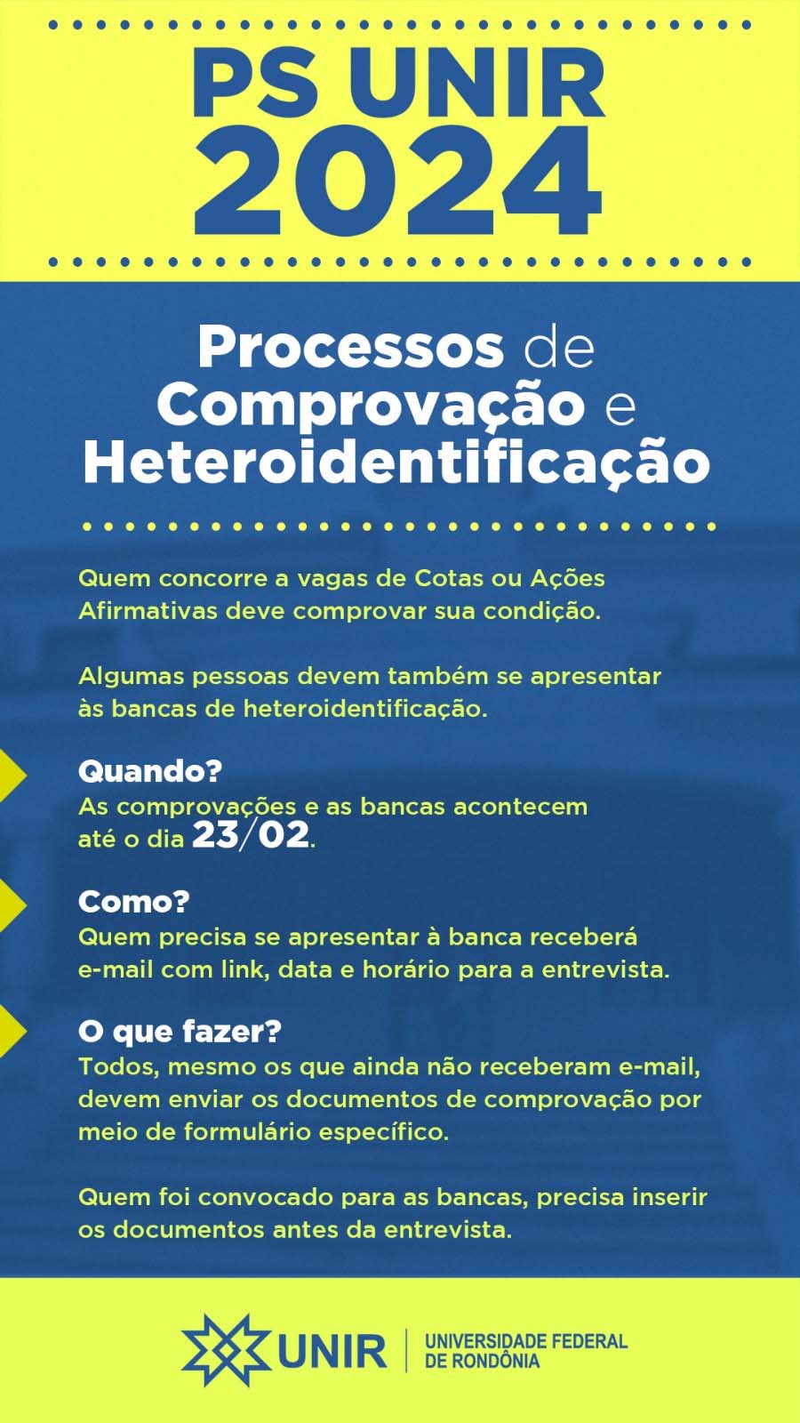 A Universidade Federal de Rondônia (UNIR) iniciou no dia 14 de fevereiro o processo de comprovação e heteroidentificação, validação e verificação do PS UNIR 2024. Nesta etapa do processo seletivo as bancas e comissões irão realizar o procedimento de heteroidentificação, validação e/ou verificação dos candidatos que se autodeclararam indígenas, quilombolas, pretos, pardos, pessoas trans e de populações do campo para as vagas de cotas e ações afirmativas no processo seletivo da UNIR. Os convocados devem realizar o envio de documentos até o dia 23 de fevereiro.