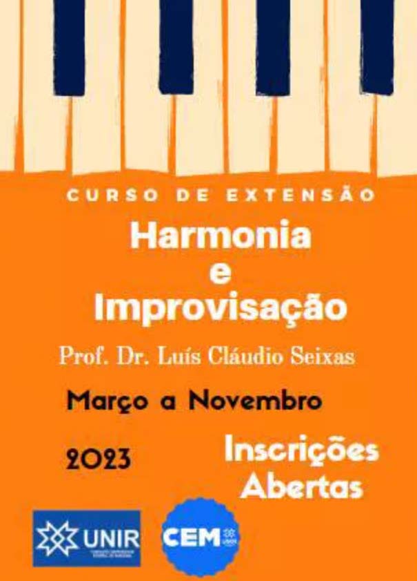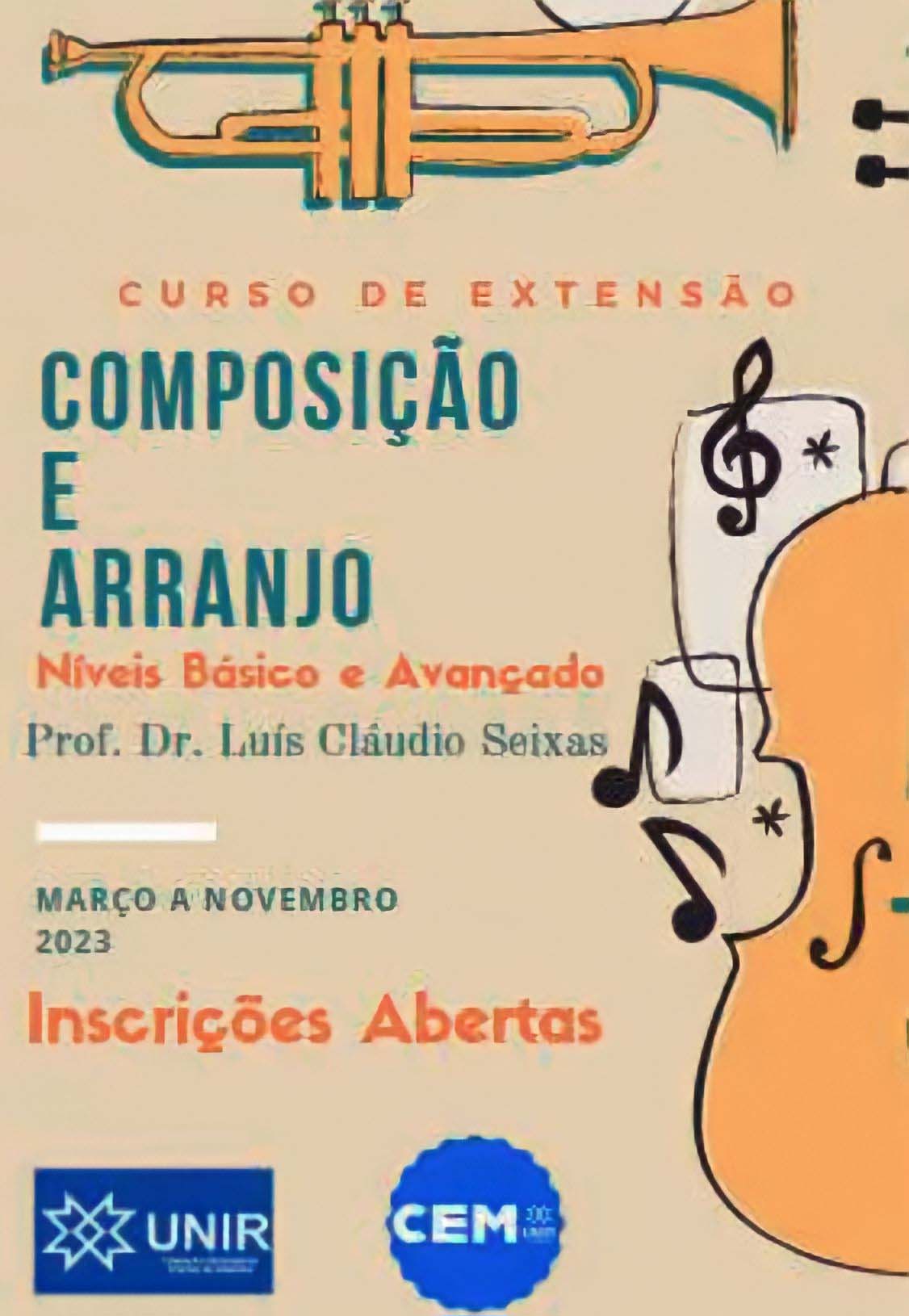 O Centro de Extensão em Música (CEM) da Universidade Federal de Rondônia (UNIR) está com inscrições abertas em dois cursos de extensão universitária, com início em 2023, de Composição e Arranjo e Harmonia e Improvisação. Os cursos serão realizados de forma online de março a novembro. As vagas são limitadas e a seleção se dará por ordem de inscrição, que deve ser feita por meio do preenchimento do formulário disponível neste link.