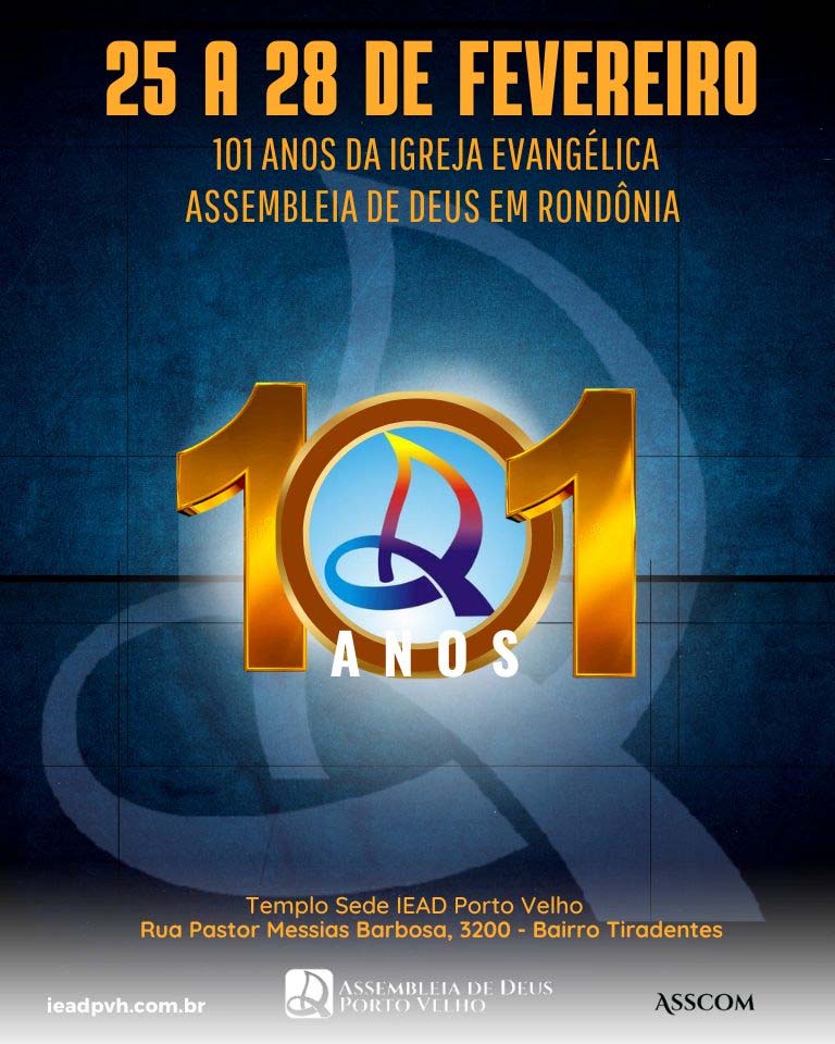 A Igreja Evangélica Assembleia de Deus em Rondônia comemora, a partir de 25 de fevereiro, os 101 anos de sua existência no Estado. O evento acontecerá no Templo Sede, na rua Pastor Messias Barbosa, 3200, bairro Tiradentes em Porto Velho.