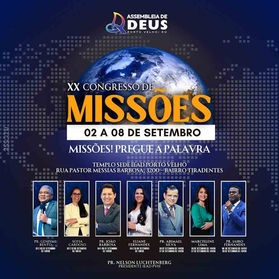 Em sua XX edição em Porto Velho, você e sua família não podem ficar de fora, de 2 a 8 de setembro, às 19h30, na igreja Evangélica Assembleia de Deus, rua Pastor Messias Barbosa, 3200, bairro Tiradentes.