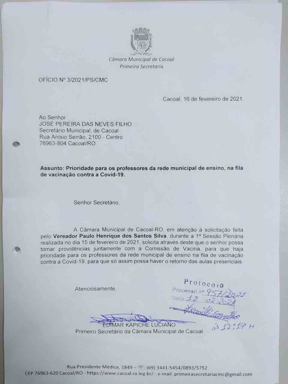 Não são apenas os profissionais da educação, sociedade civil, pais de alunos que rejeitam a decisão do Governo de decretar o retorno às aulas a partir de fevereiro em Rondônia. O vereador Dr. Paulo Henrique (PTB), membro da Comissão de Educação da Câmara de Cacoal, manifestou sua solidariedade aos profissionais de educação de Rondônia, durante a audiência pública online promovida pelo Sintero em parceria com a prefeitura de Cacoal e na 1ª e 2 ª sessão ordinária da Câmara de Cacoal. O parlamentar exigiu das autoridades sanitárias prioridade no plano de vacinação para os profissionais da educação e a comunidade estudantil.