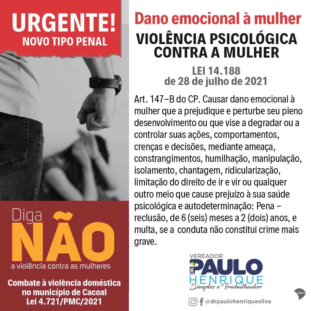 Foi sancionada a Lei 4.721/PMC/2021, de autoria do vereador Dr. Paulo Henrique, que visa implementar medidas para efetivação da Lei Maria da Penha e o combate à violência doméstica no município.