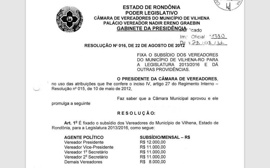 Em 22 de agosto de 2012, vereadores da legislatura passada votaram o salário para a legislatura de 2013 a 2016 que foi fixado em Presidente: R$ 12.000,00; vice-Presidente, 1º e 2º Secretário: R$ 11.000,00 e demais vereadores: R$ 8.000,00.