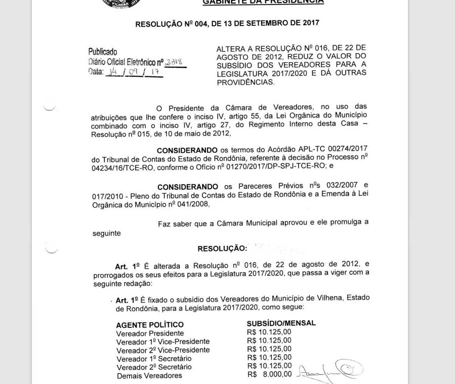 Porém, em setembro de 2017, os atuais vereadores reduziram os próprios salários fixando-os em Presidente, 1º e 2º Vice-Presidentes, 1º e 2º Secretários – R$ 10.125,00 e demais Vereadores – R$ 8.000,00.