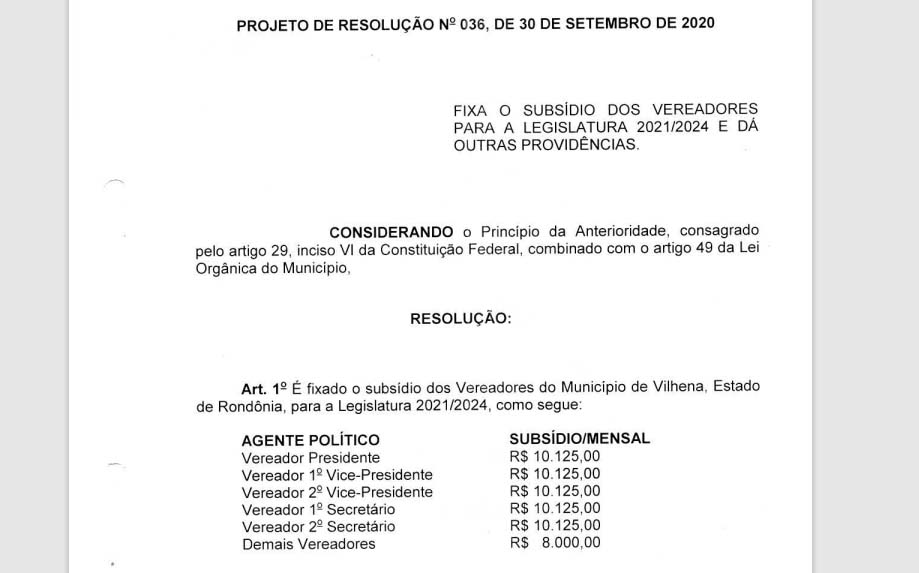 Na 25ª sessão ordinária que acontece nesta terça-feira, 13, os vereadores vão votar o Projeto de Resolução nº 036/2020 que fixa o subsídio dos Vereadores (Presidente, 1º e 2º Vice-Presidentes, 1º e 2º Secretários – R$ 10.125,00 e demais Vereadores – R$ 8.000,00) para a Legislatura 2021/2024.