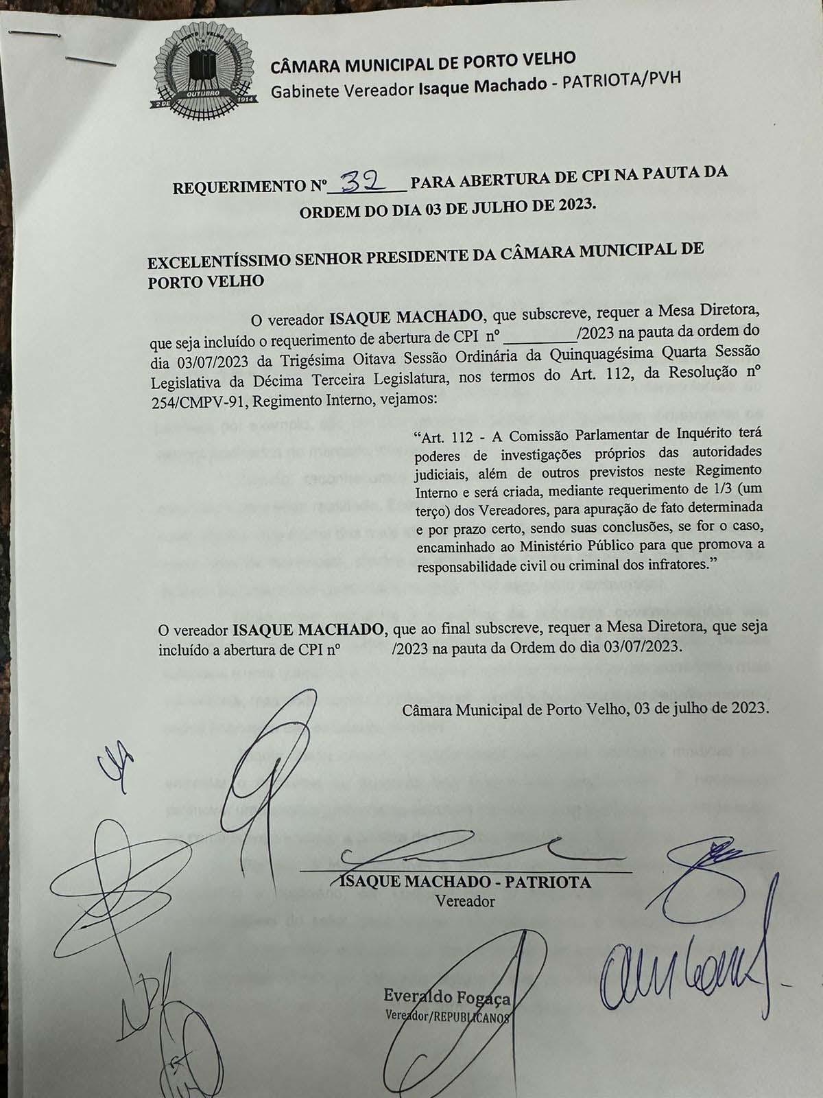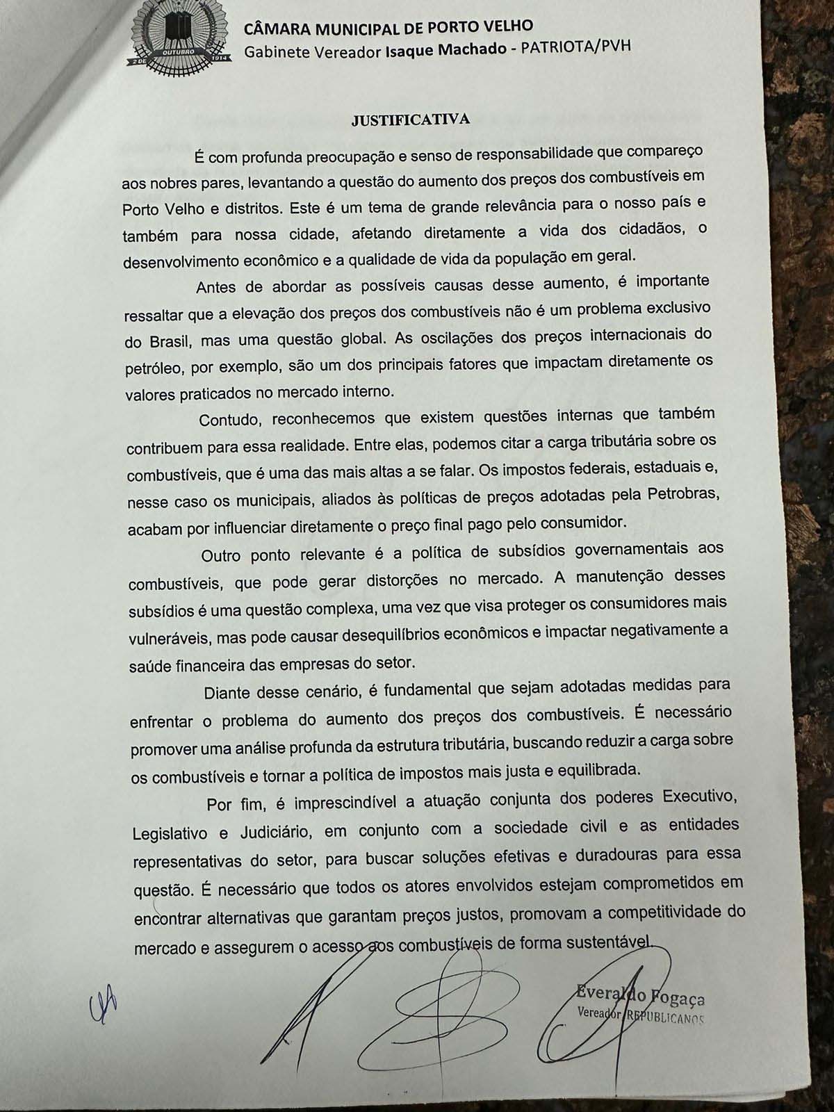 Porto Velho, RO - Os vereadores Isaque Machado, Everaldo Fogaça, Rai Ferreira, Edimilson Dourado, Alex Palittot, Júnior Queiroz, Jurandir Bengala, Márcia Socorrista e Gilber Mercês apresentaram um requerimento para a abertura de uma Comissão Parlamentar de Inquérito (CPI) para investigar o aumento dos preços dos combustíveis em Porto Velho e distritos.