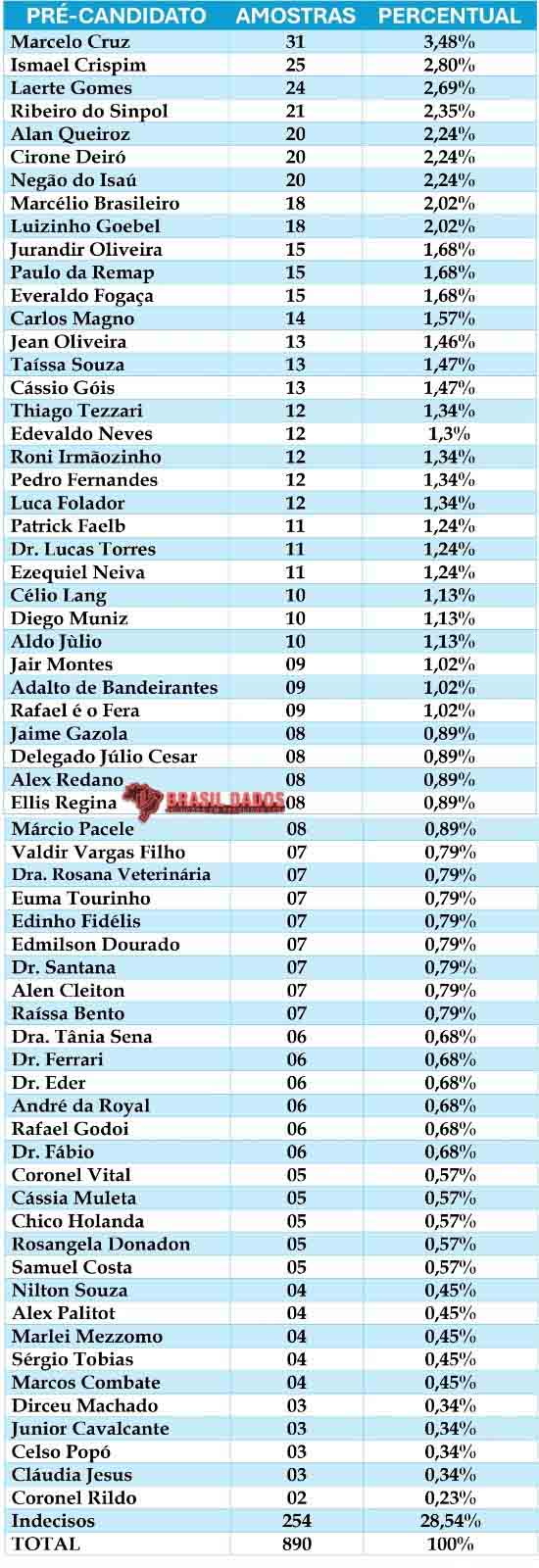 Se a eleição fosse hoje, segundo a pesquisa, o presidente da Assembleia Legislativa de Rondônia, Marcelo Cruz (PRTB) seria o mais votado com 3,48% das intenções de voto, seguido de dos também deputados estaduais Ismael Crispim (MDB) (2,80%), Laerte Gomes (PSD) (2,69%), Ribeiro do Sinpol (PRD) (2,35%), Alan Queiroz (PODEMOS) e Cirone Deiró (UB), empatados com 2,24%.
