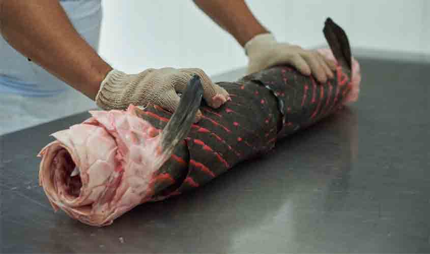 A pele do pirarucu, que até pouco tempo era descartada, tem sido utilizada para a confecção de roupas, acessórios e estofados, agregando ainda mais valor ao pescado de origem sustentável