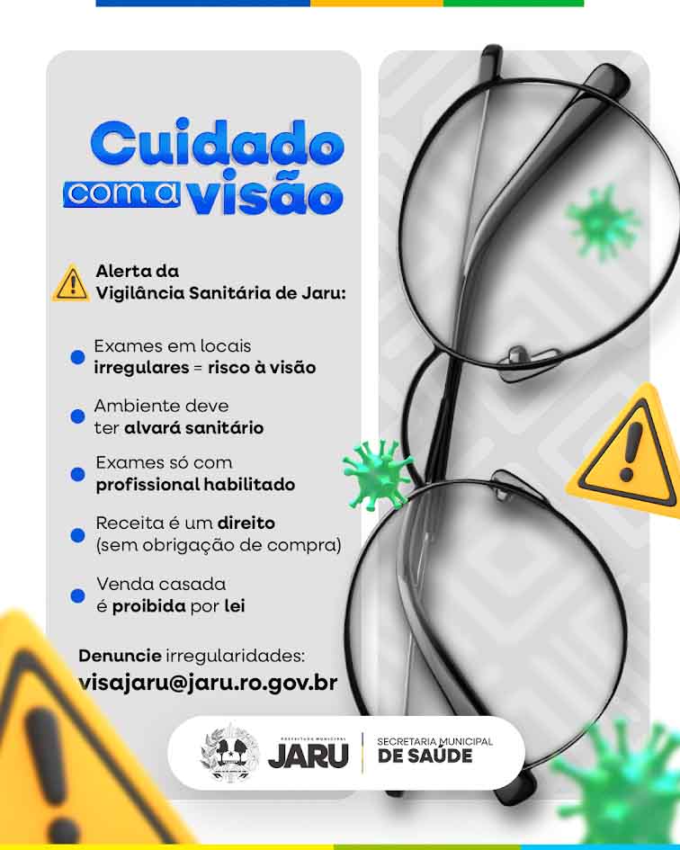A Vigilância Sanitária de Jaru intensificou as orientações à população sobre os cuidados com a saúde ocular e o combate a práticas irregulares na realização de exames oftalmológicos. A iniciativa visa prevenir riscos à saúde dos olhos e garantir o cumprimento da legislação sanitária.
