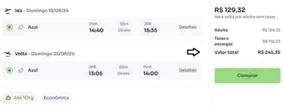 A decisão da companhia Azul de aumentar a oferta de voos em Rondônia está ajudando na redução dos preços das passagens aéreas no estado. Por exemplo, quem for viajar de Porto Velho para Ji-Paraná em voo direto da Azul pagará pelos bilhetes de ida e volta apenas R$ 245. (Confira detalhes na imagem abaixo).