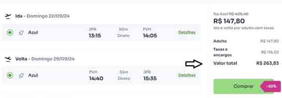 Não é uma tarefa fácil encontrar voos baratos para embarque em Rondônia. Uma das formas de garantir uma economia é pelo feirão de passagens aéreas do final de semana. Na promoção da Azul tem passagens de Porto Velho para Ji-Paraná por apenas R$ 263, valor de ida e volta com taxas de embarques inclusas. (Confira detalhes na imagem abaixo).